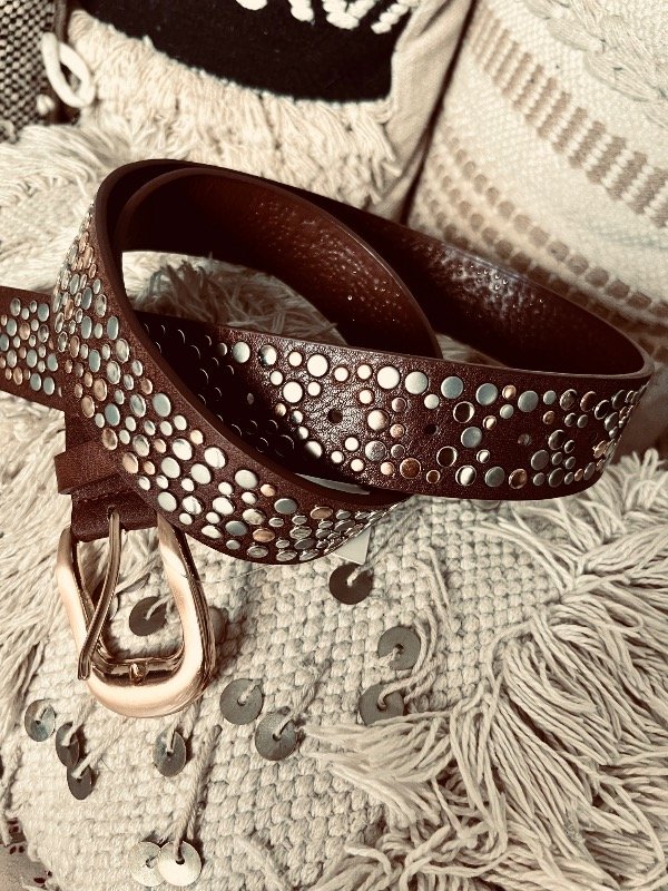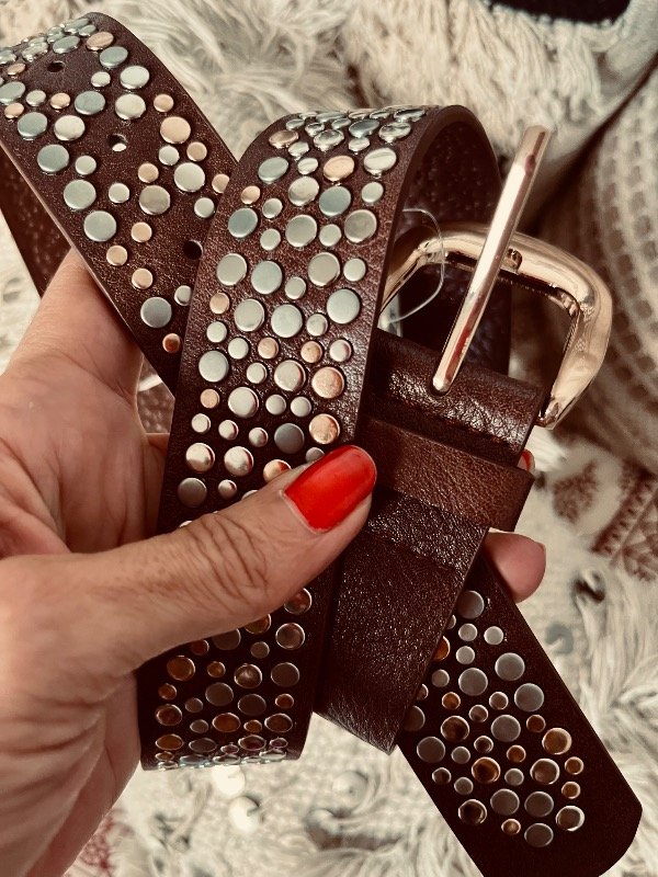 Cinturón en cuero ecológico , hebilla dorada fantasía , tachas en plata oscura y óxido