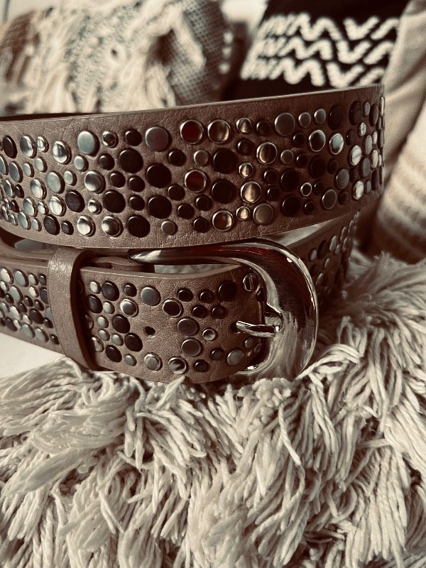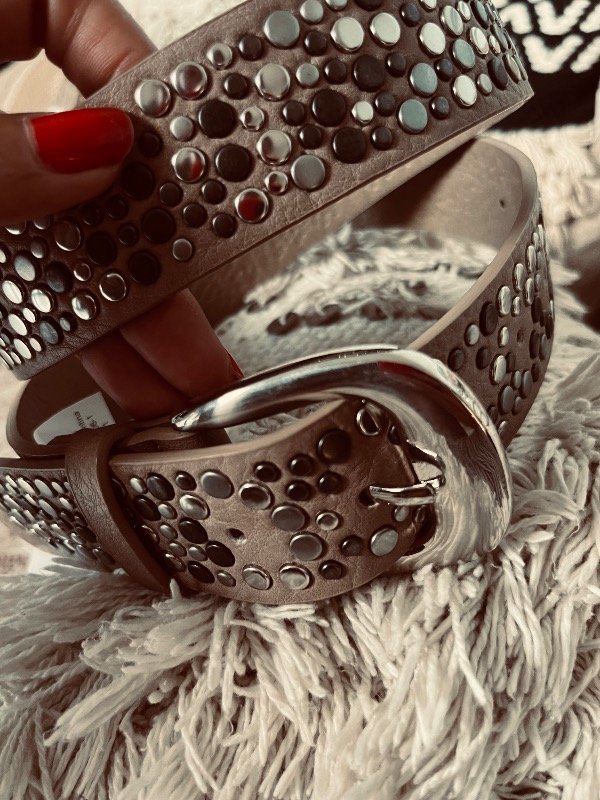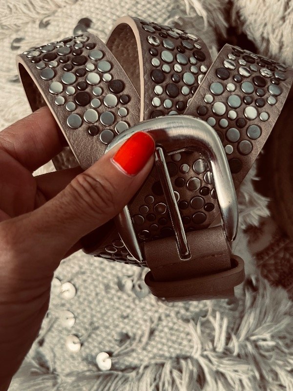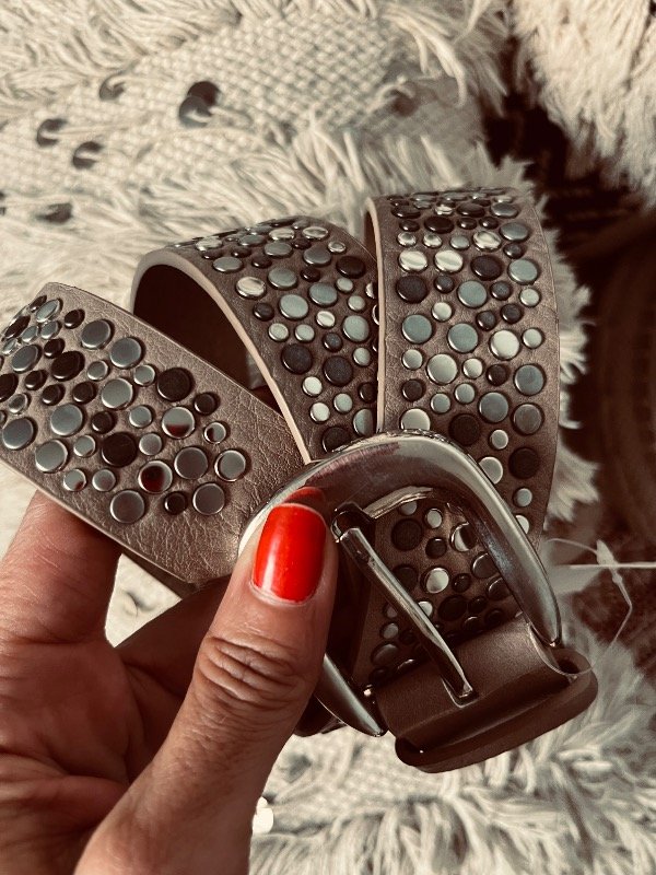 Cinturón en cuero ecológico , hebilla dorada fantasía , tachas en plata oscura y óxido