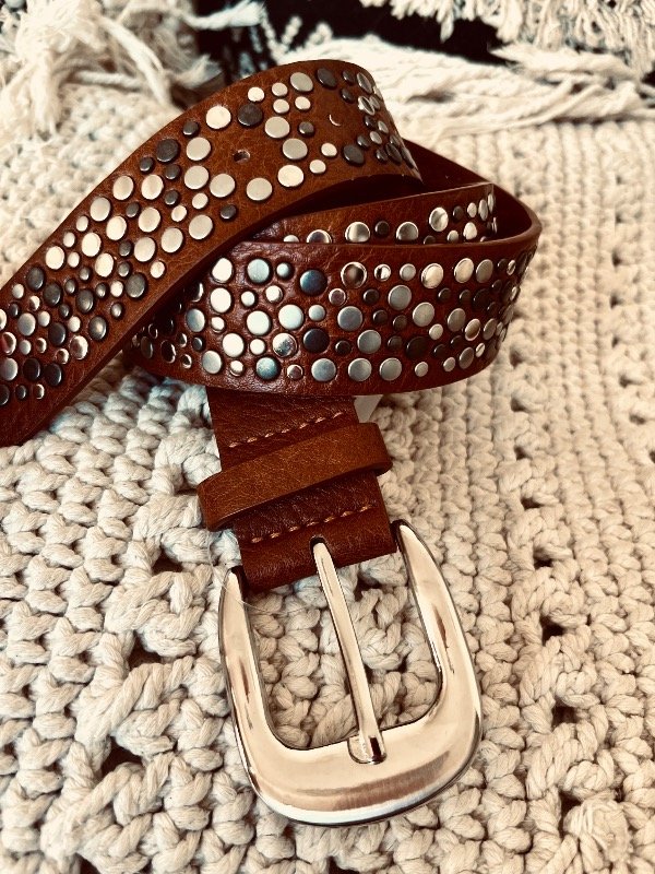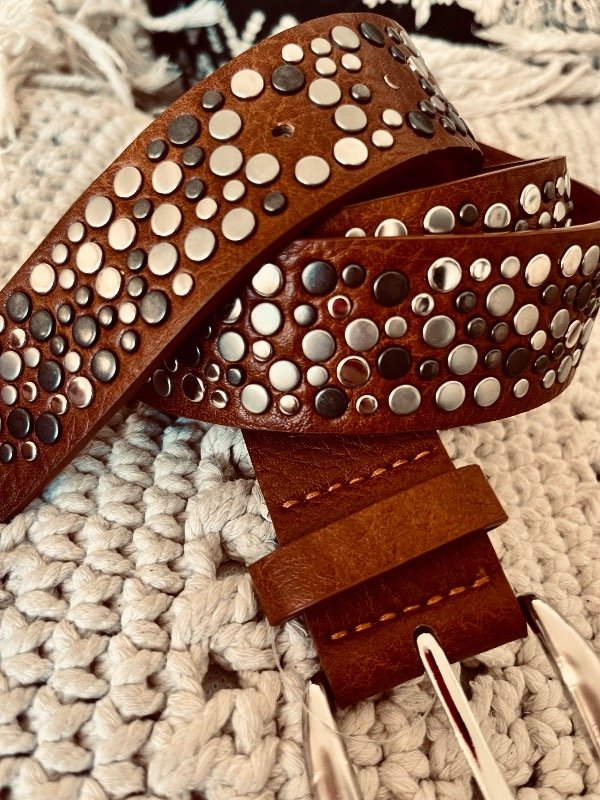 Cinturón en cuero ecológico , hebilla dorada fantasía , tachas en plata oscura y óxido