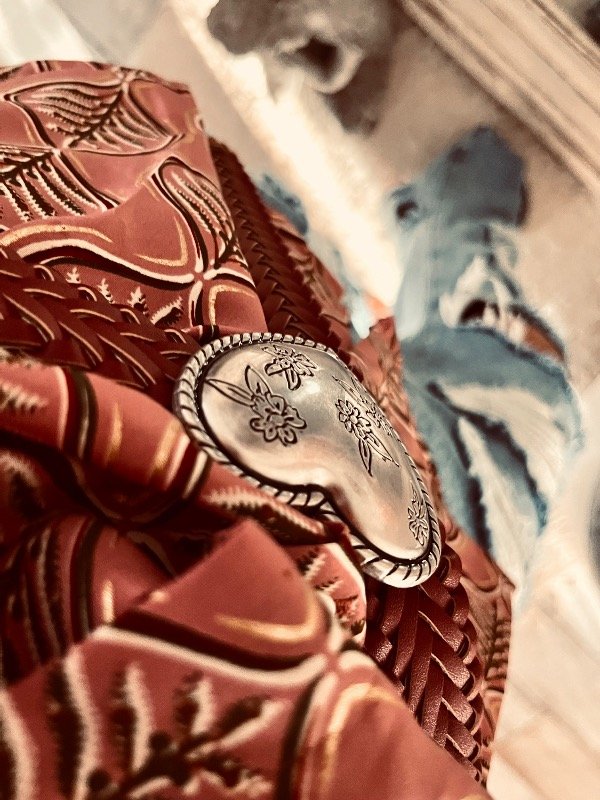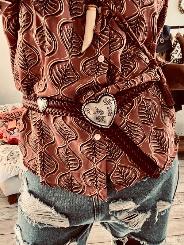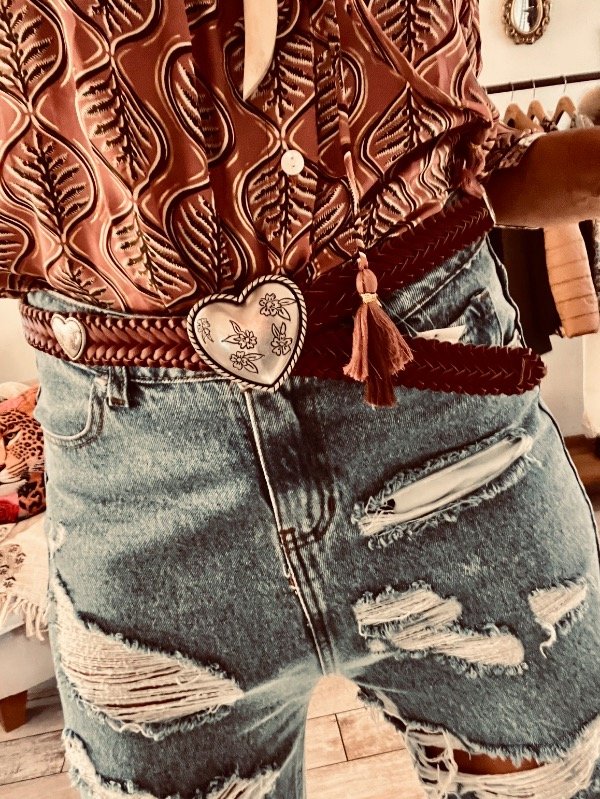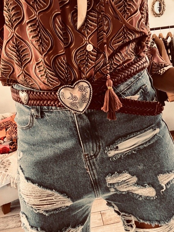 Cinturón trenzado , con hebilla corazón y corazones plata apliques