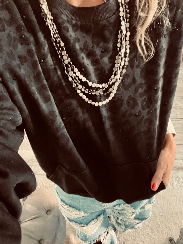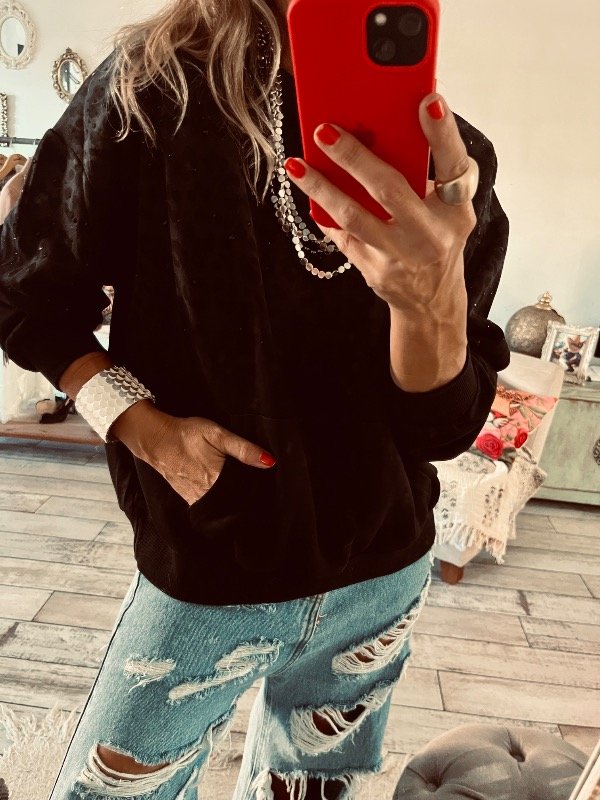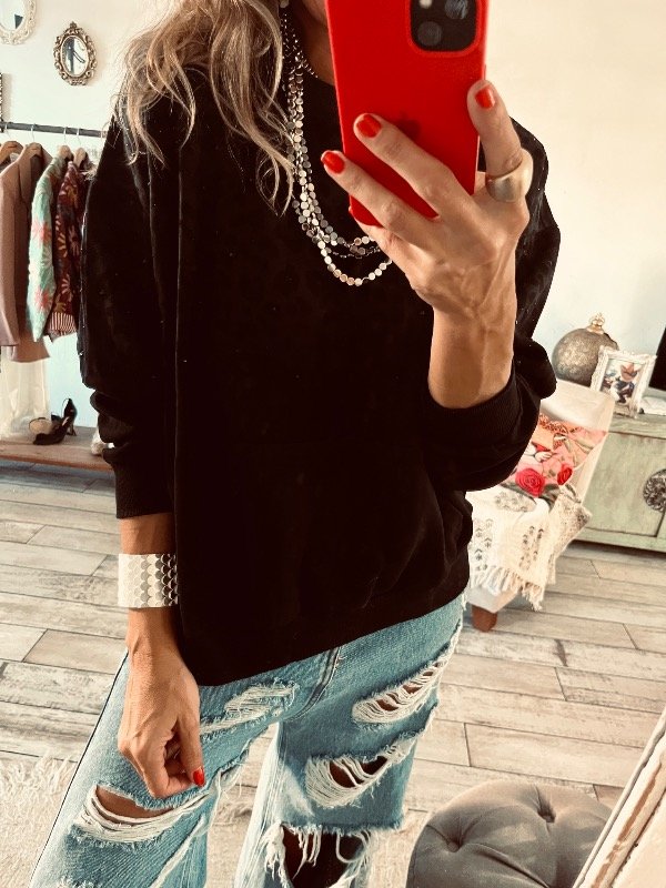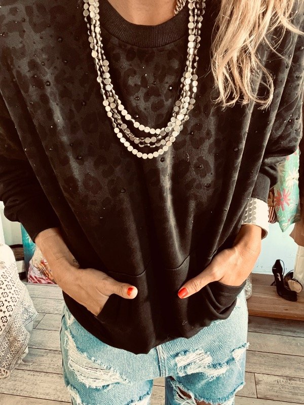 Buzo importado con detalle de animal en el cuello y espalda ,strass negros , bolsillos delanteros