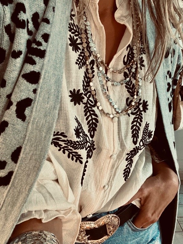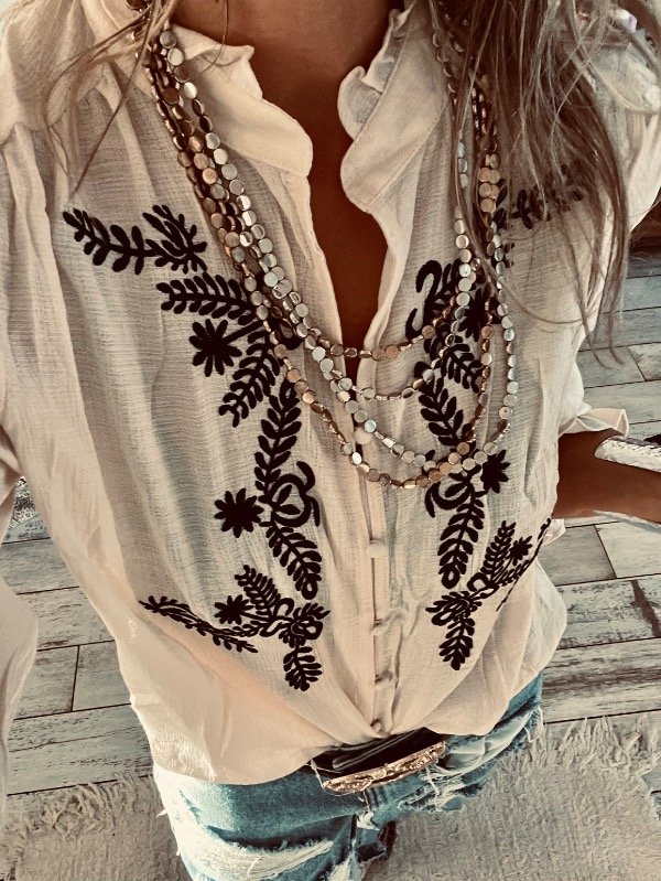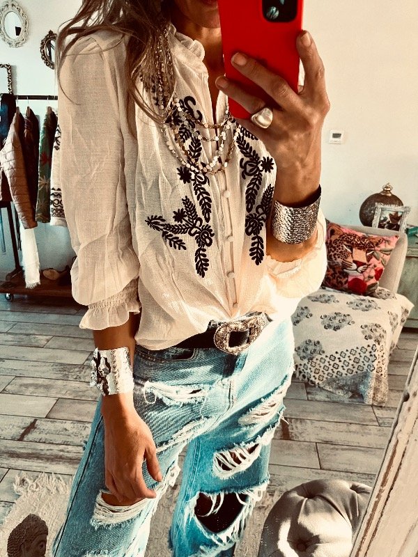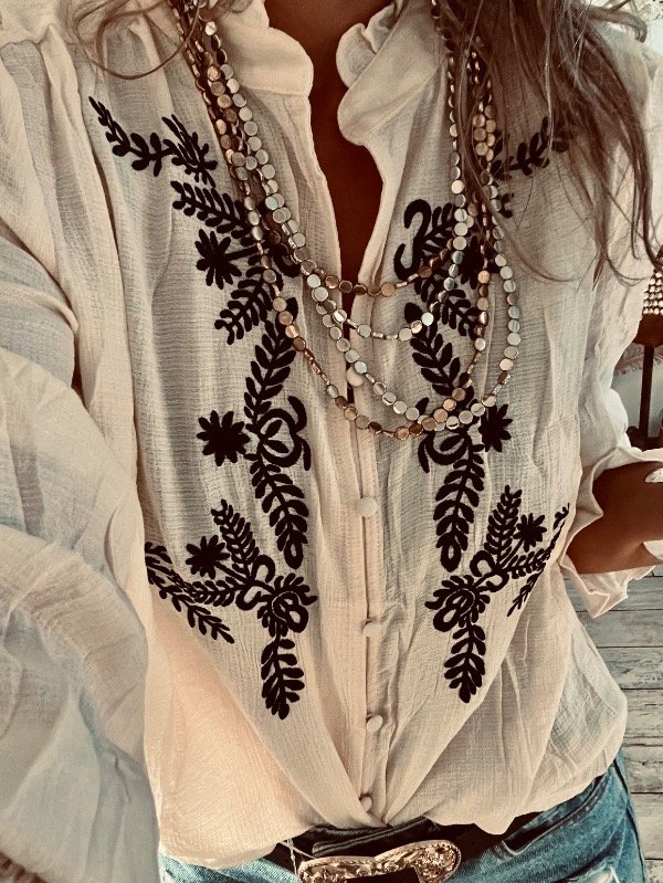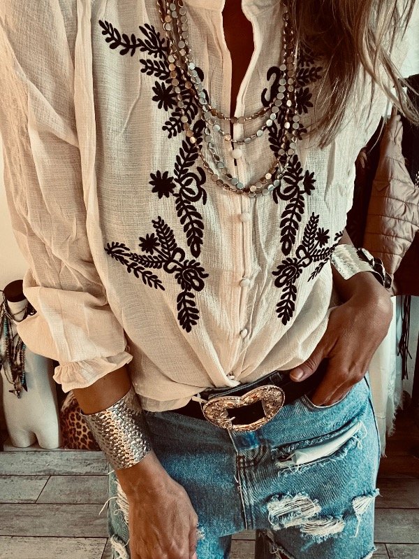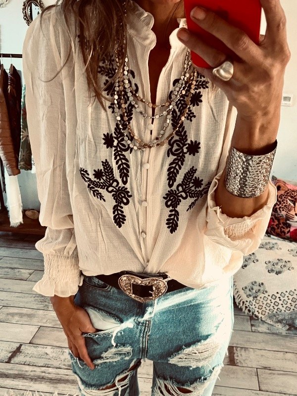 blusa importada en bambula sedosa con bordado al frente ,cuello mao con volados .botones forrados y elástico en el puño