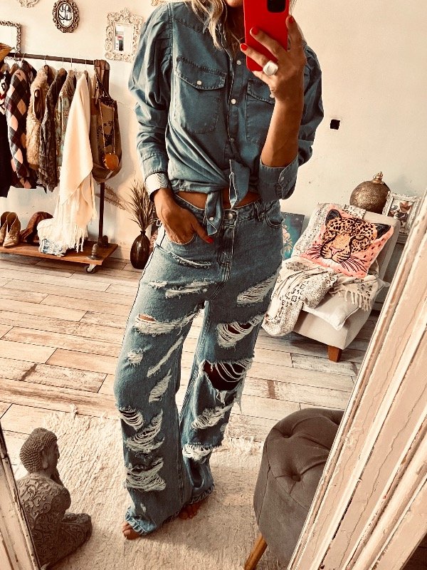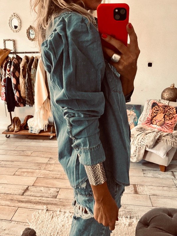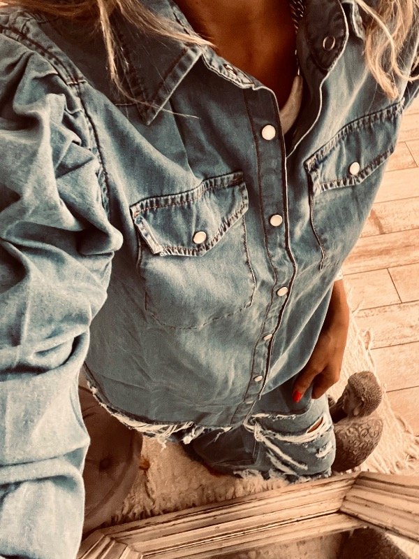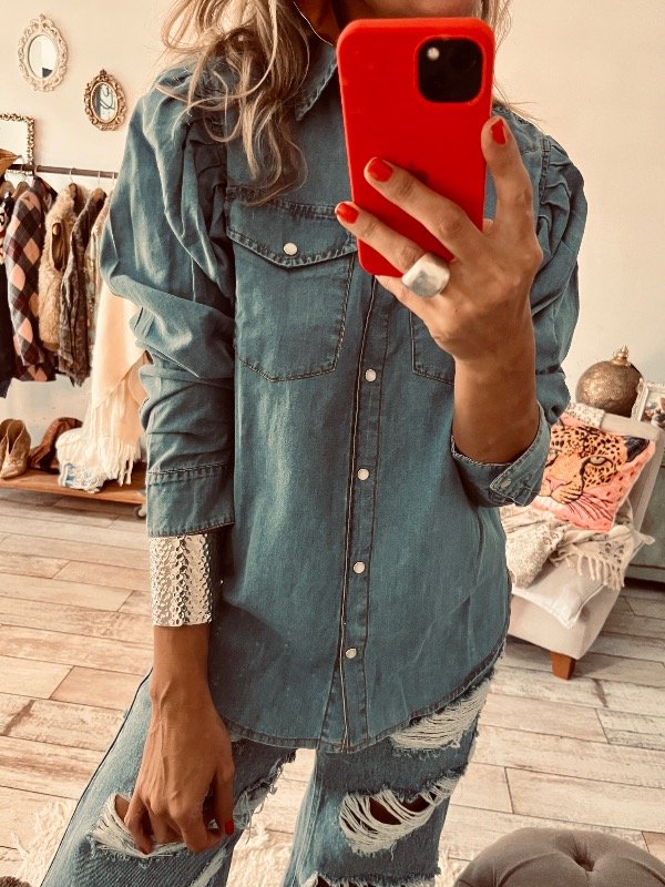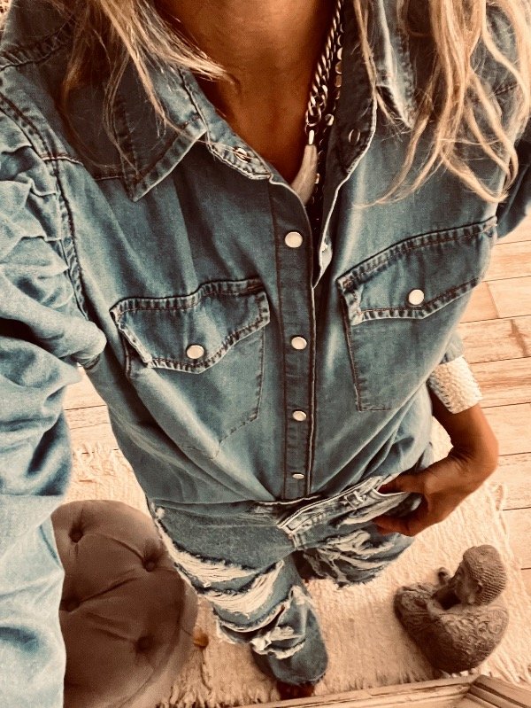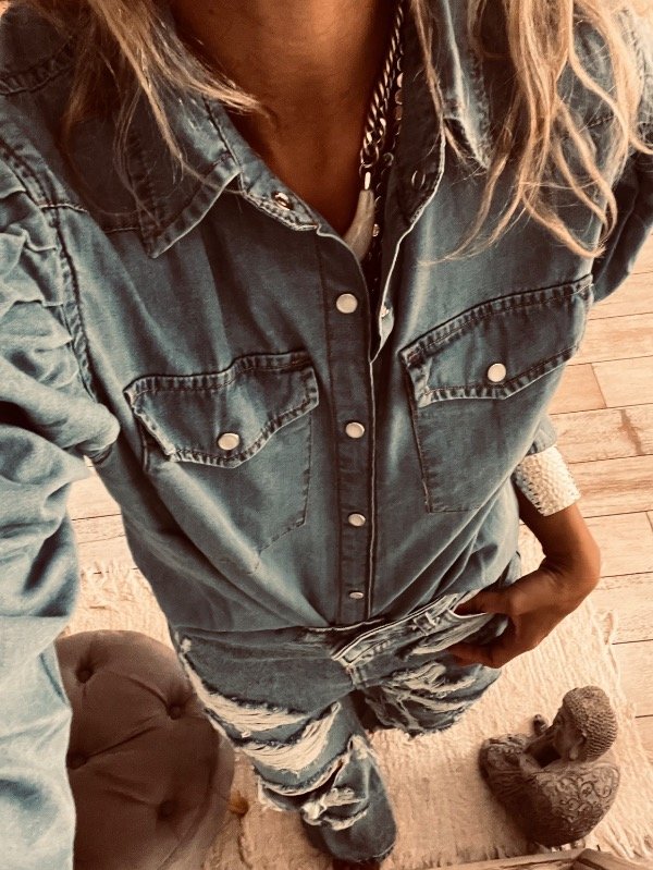Camisa de jeans liviano con broches delanteros, pinzas en hombros