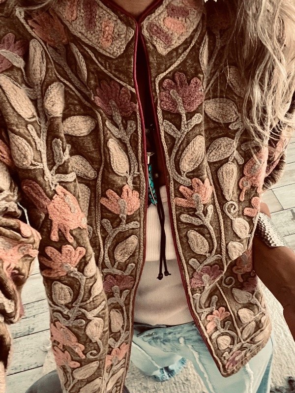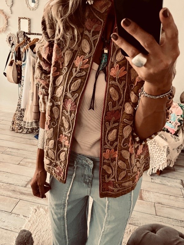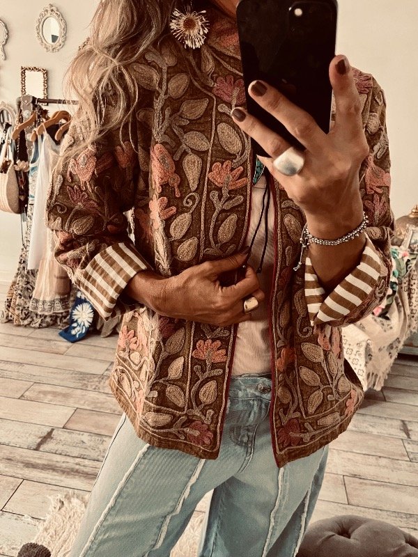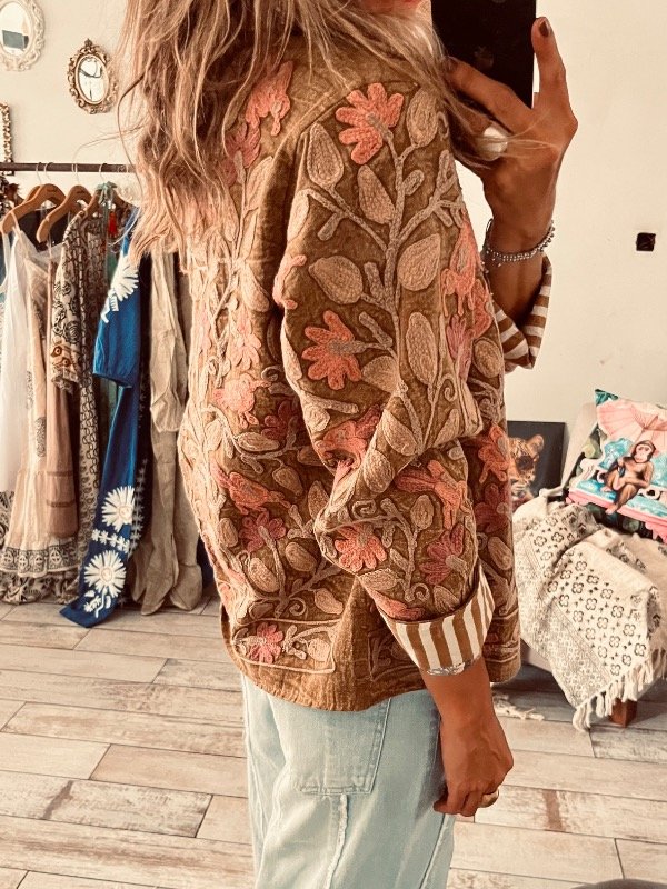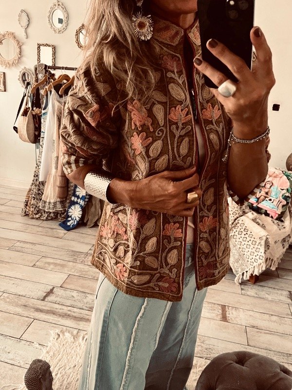Chaqueta india forrada , cuello mao . Sin botón ni cierres , íntegramente bordada
