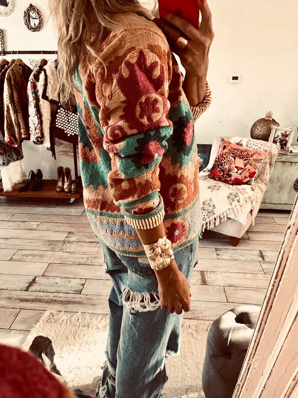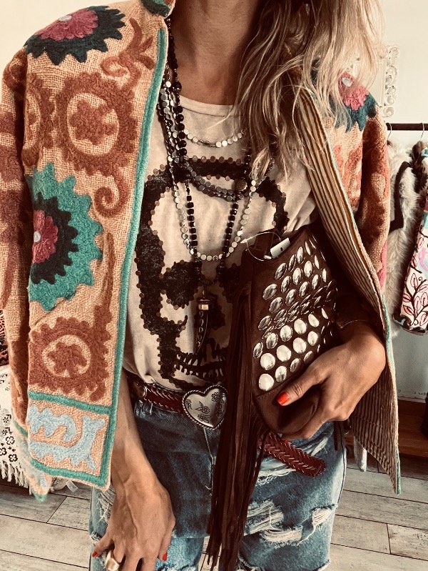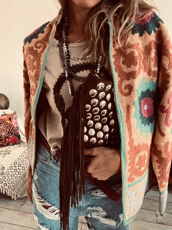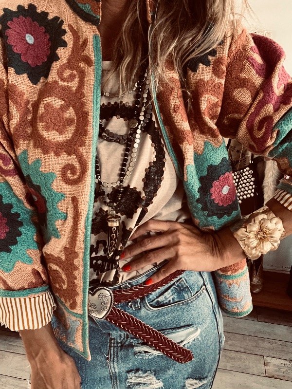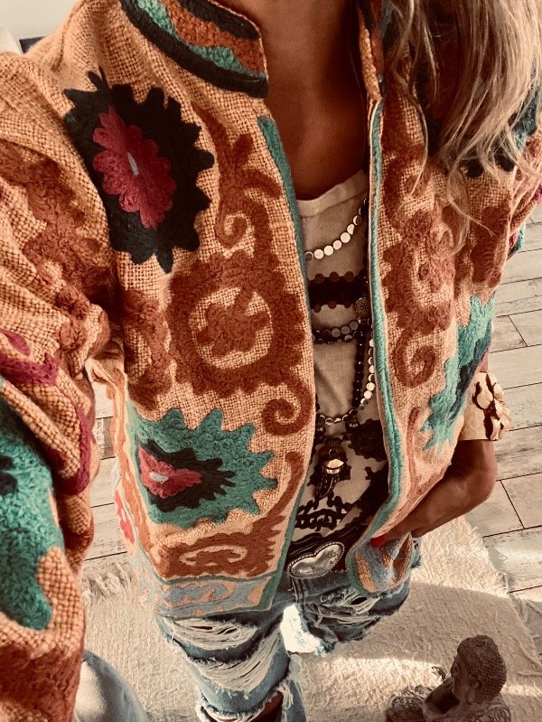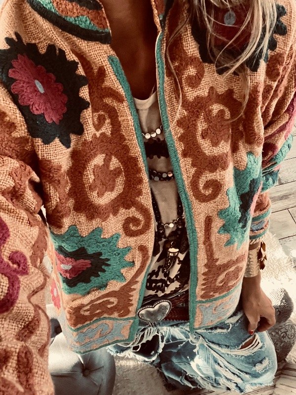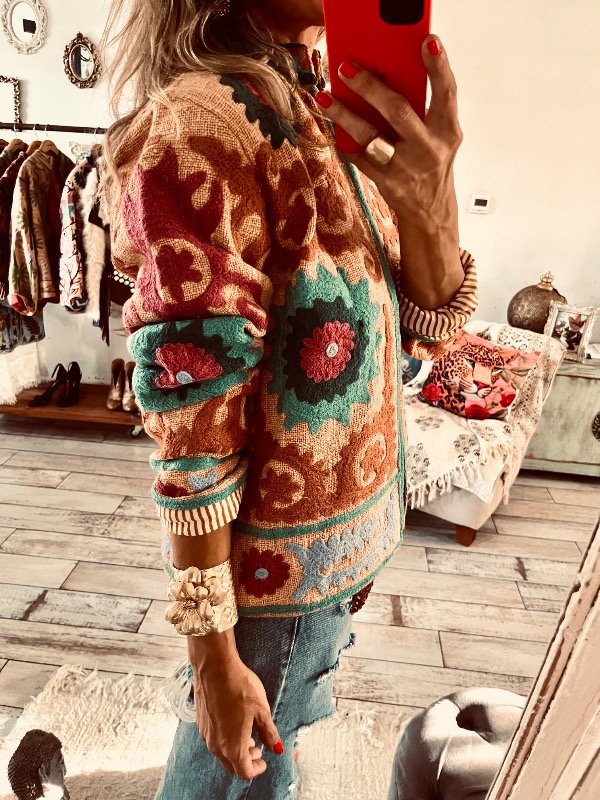 Chaqueta importada India forrada en tela rayada , toda bordada en mangas delantera y espalda , cuello mao