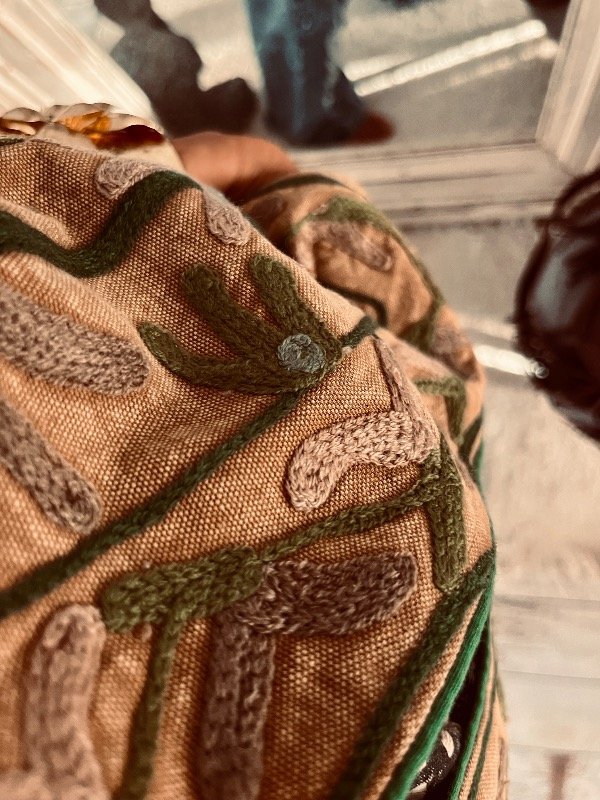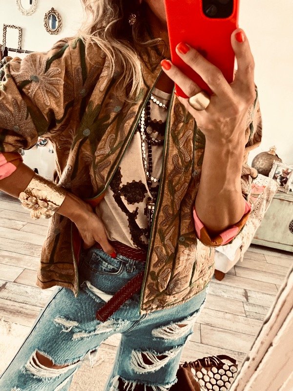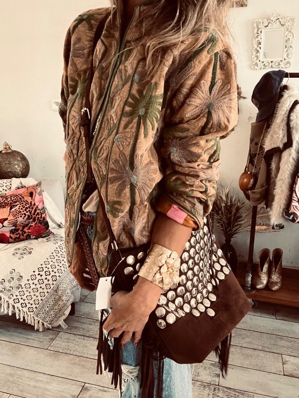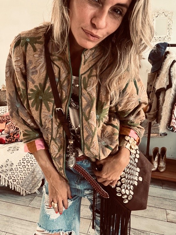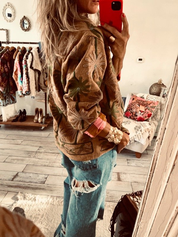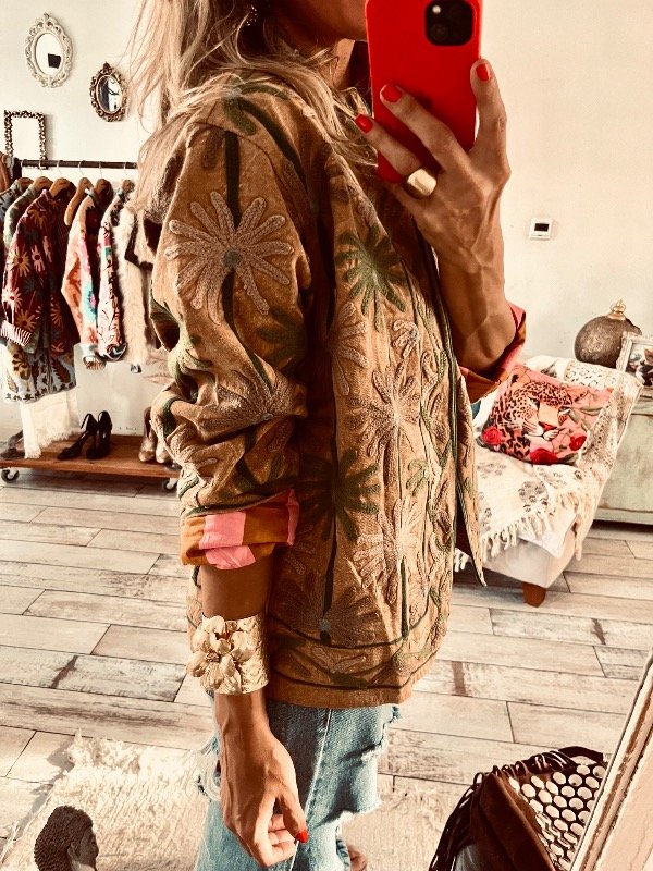 Chaqueta importada India , forrada con tela rayada , viene toda bordada en mangas frente y espalda , no trae ni botones ni cierres, cuello mao