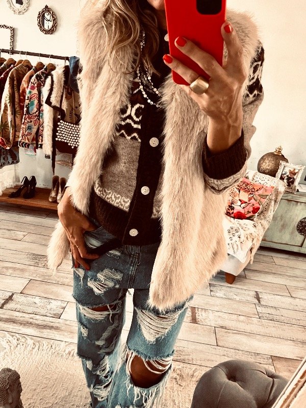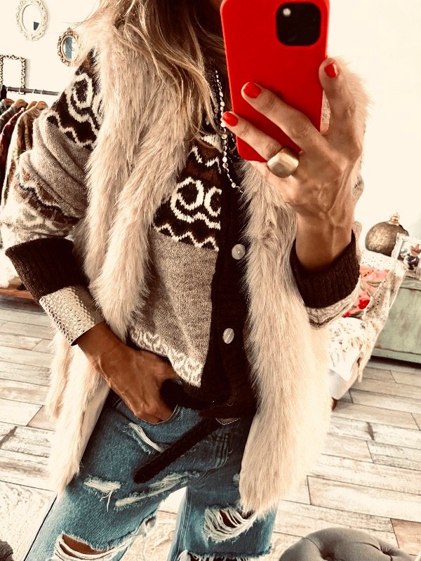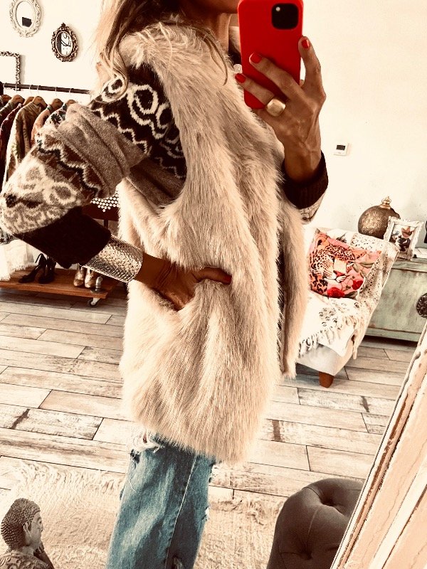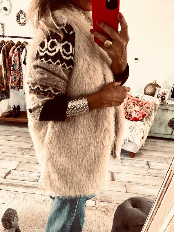Chaleco importado en piel sintética suave , forrado con bolsillos laterales, y ganchos ocultos en la parte delantera