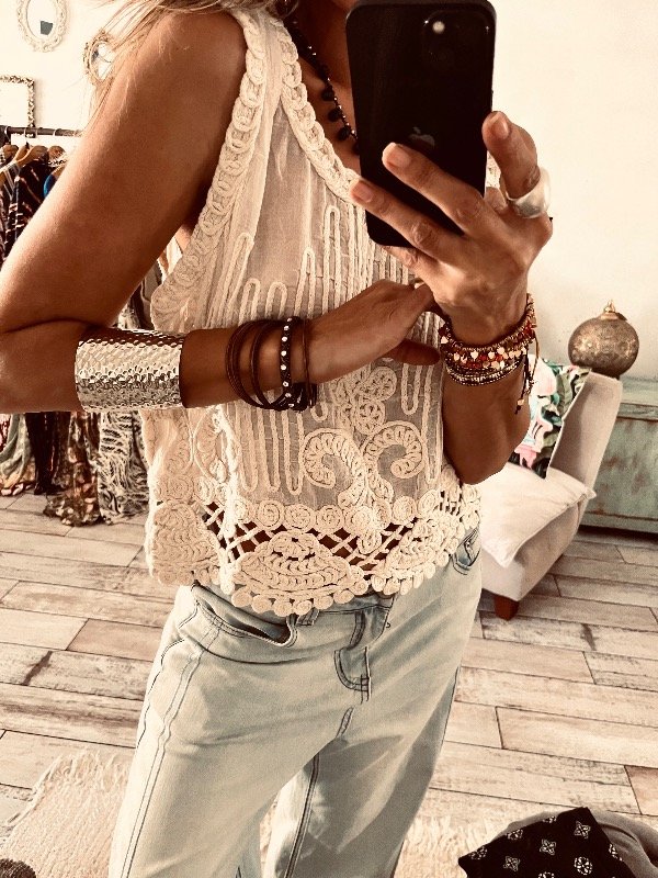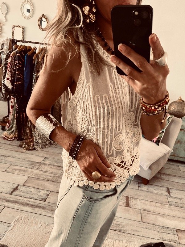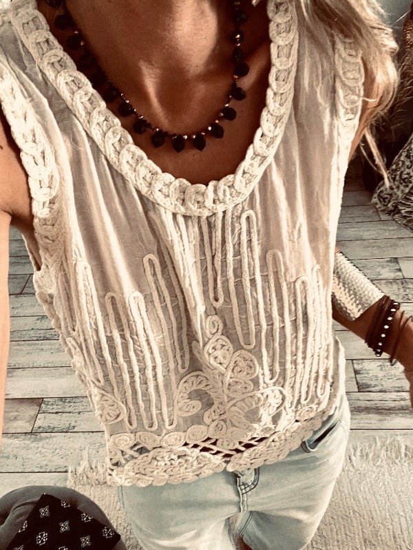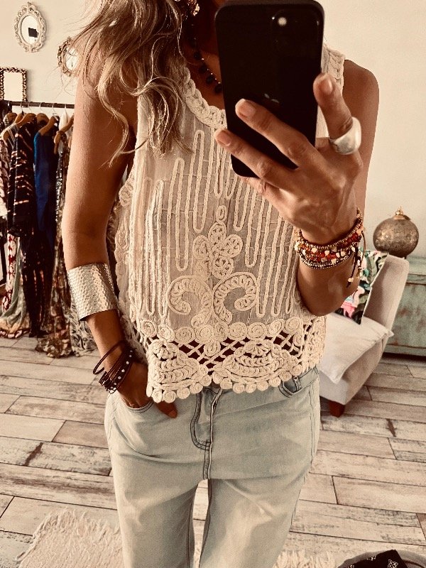 Musculosa importada , símil blusa , en tela liviana con detalle en tejido , talla única