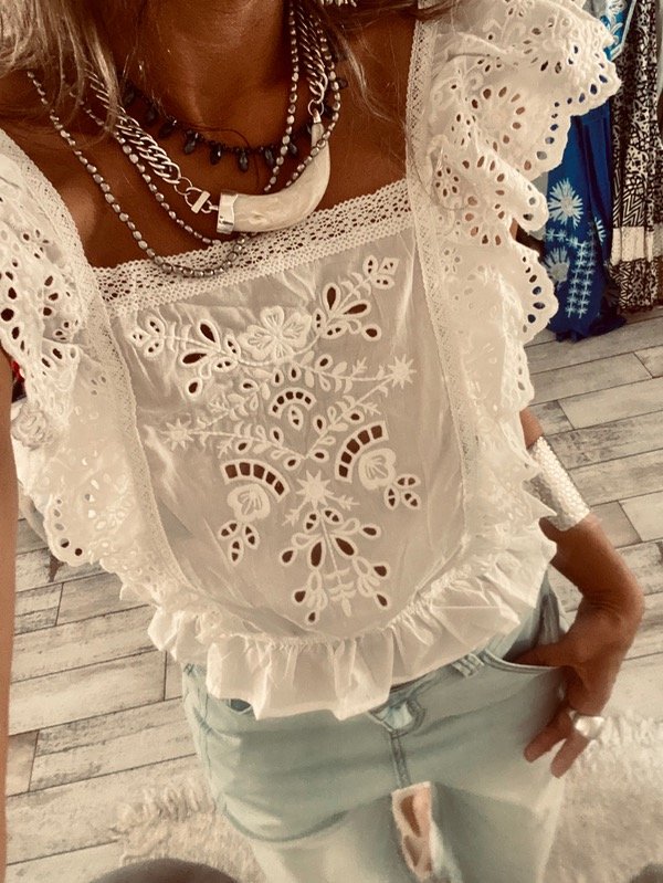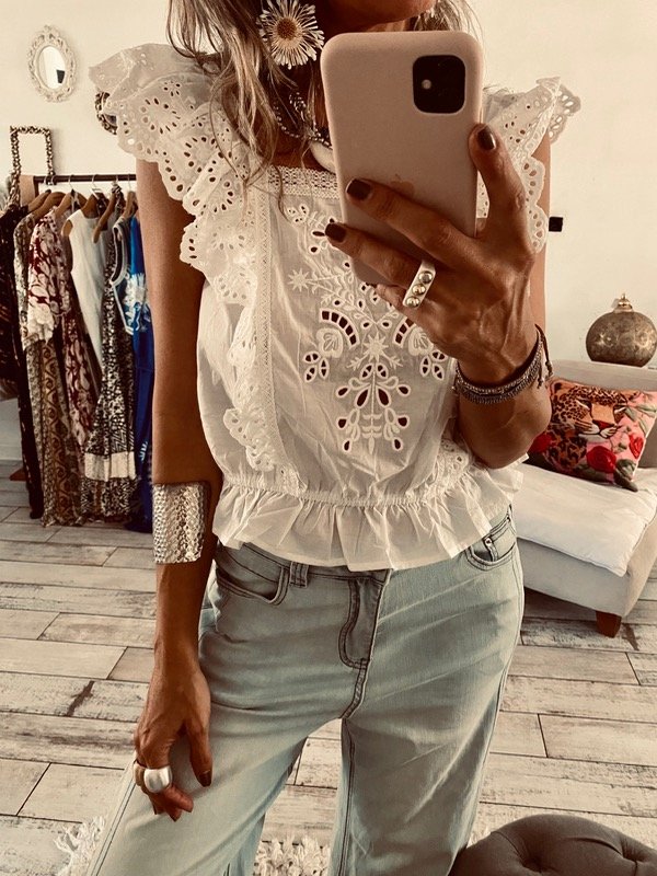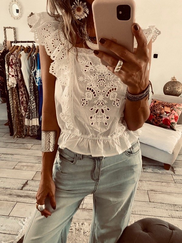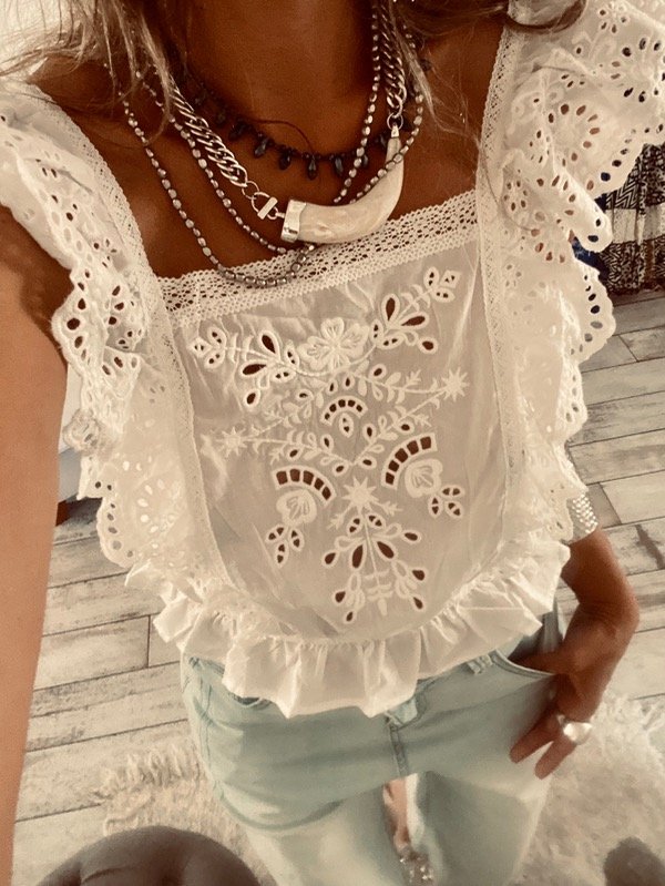 Musculosa blusa , importada , con escote cuadrado , volados en bretel y frente , detalles de brodery , calado y bordado .