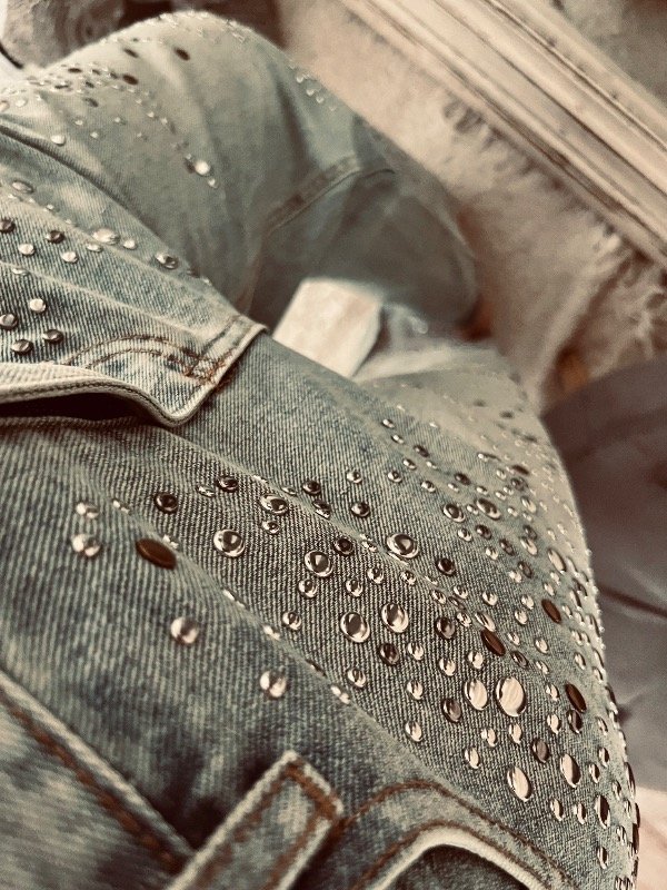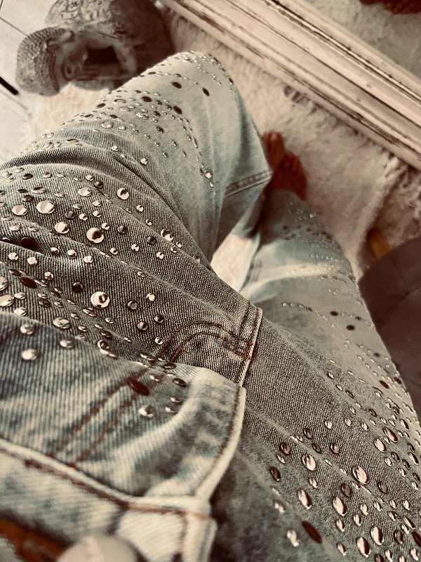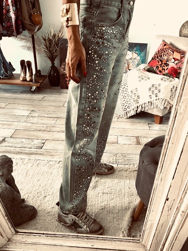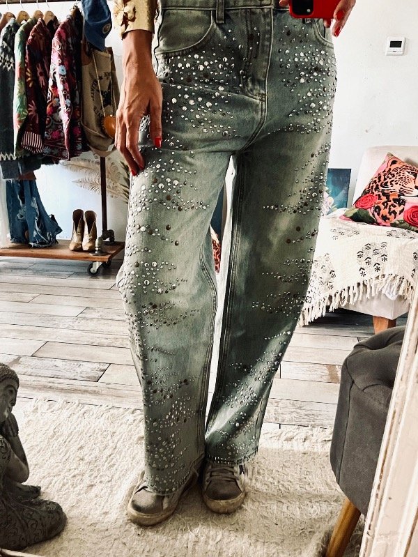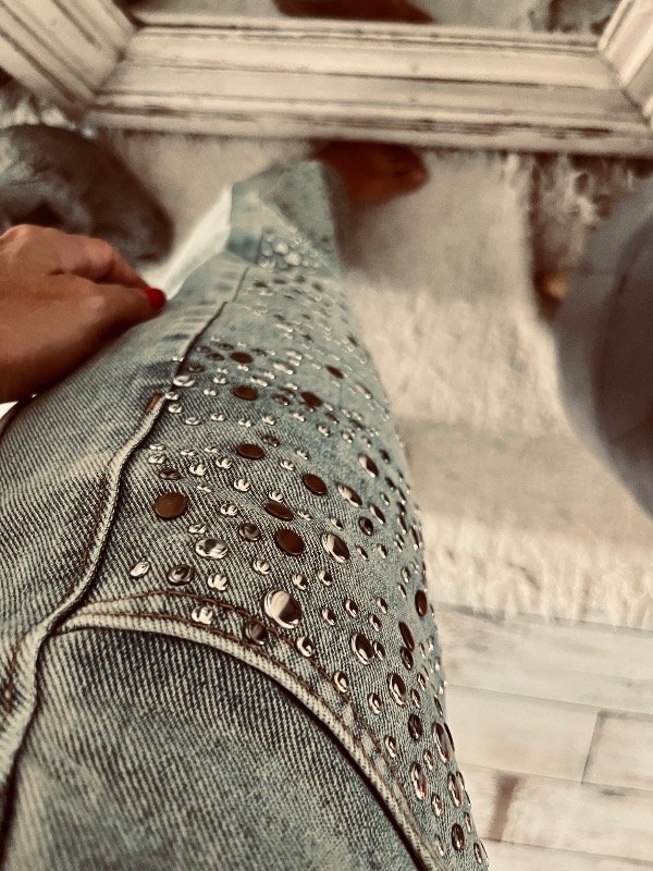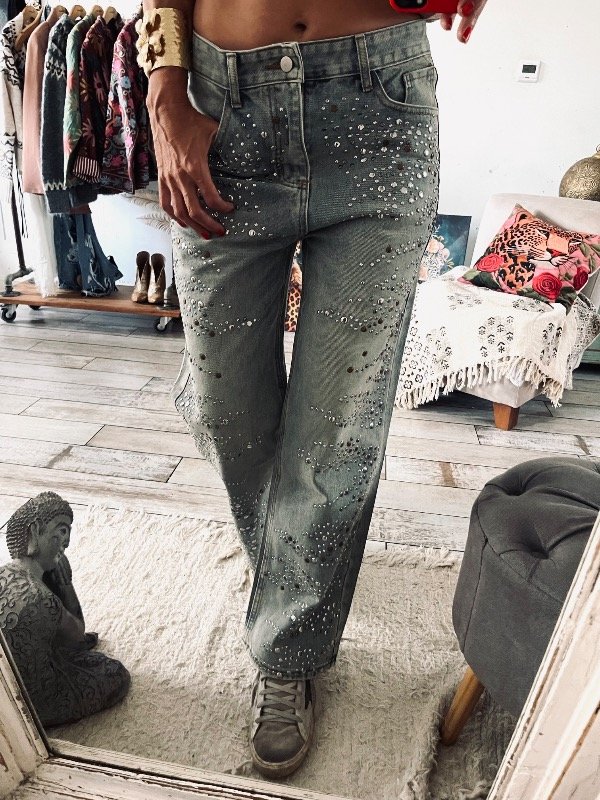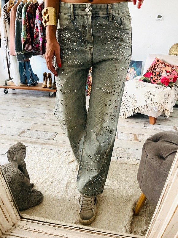Pantalón importado , modelo que rígido tiro alto medio , detalles de tachas plata y óxido