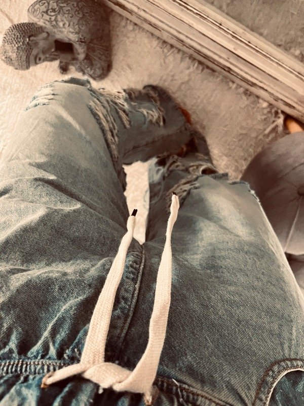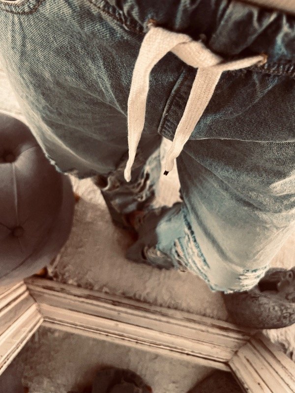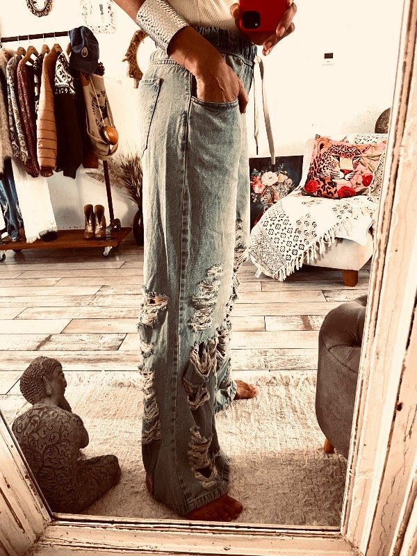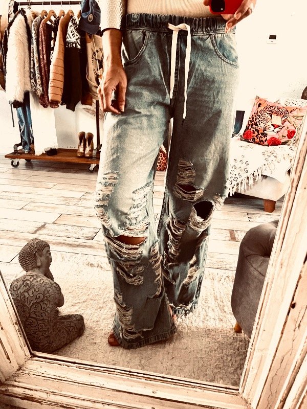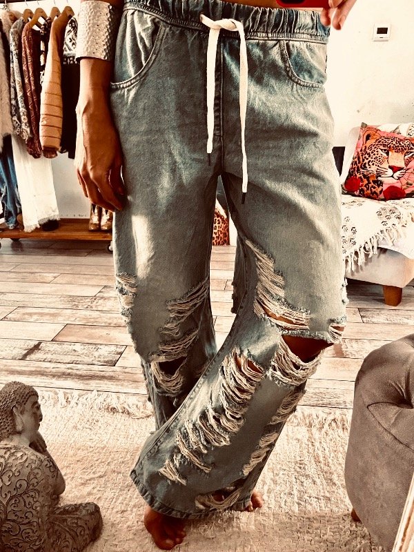 Jeans con roturas en piernas bajas , color celeste óxido , cintura elástica con cordón regulable y bolsillos laterales !