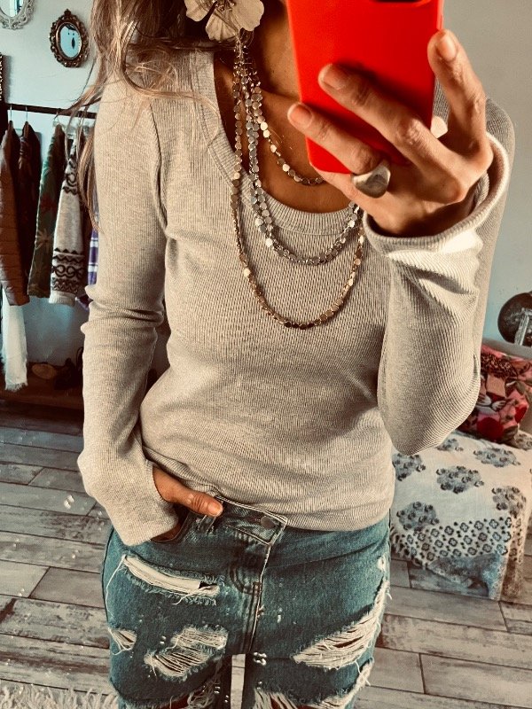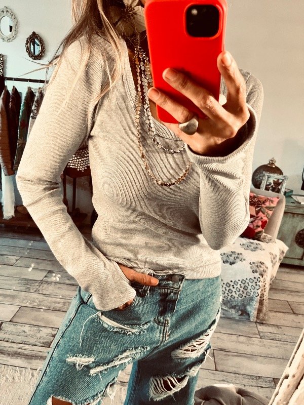 Camiseta en morley manga larga , cuello redondo y agujero en puño , simil guante