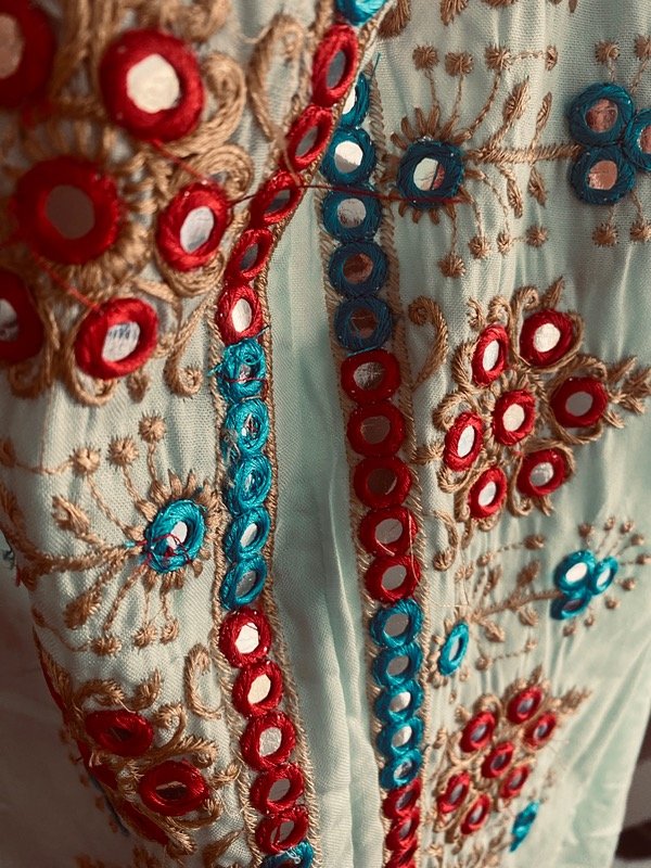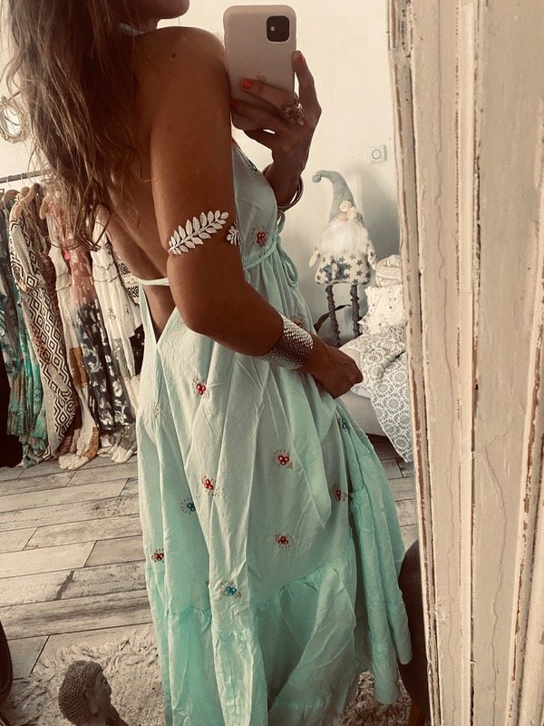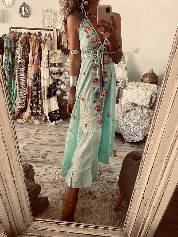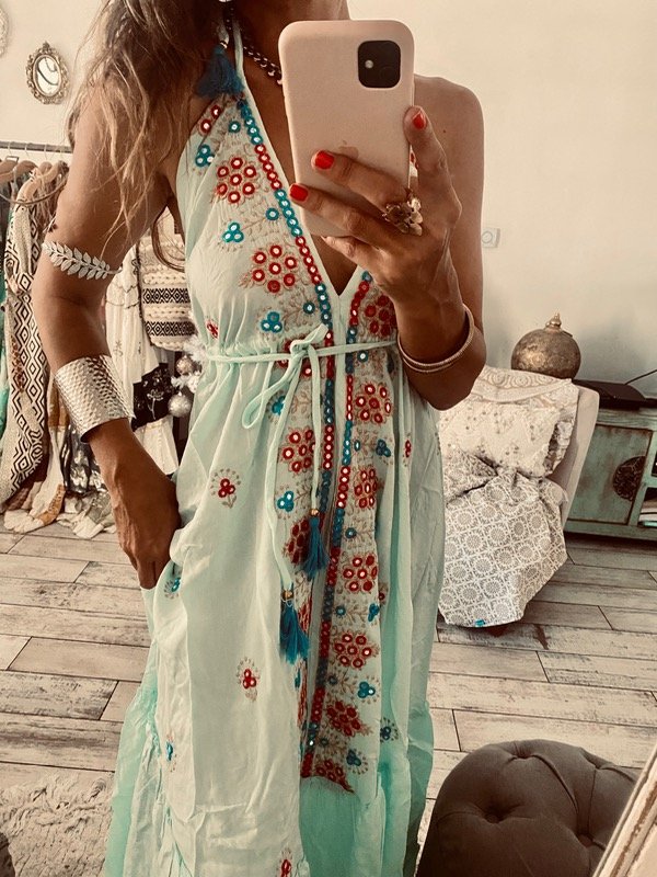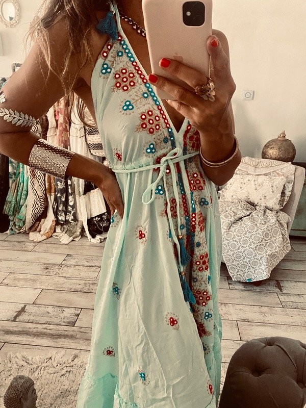 Vestido india bordado con lazos regulares en cuello y espalda , forrado