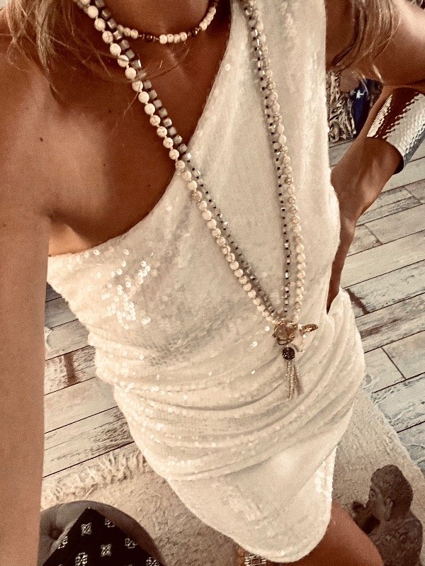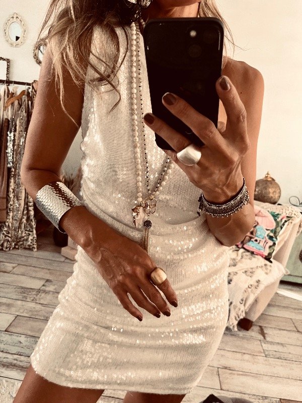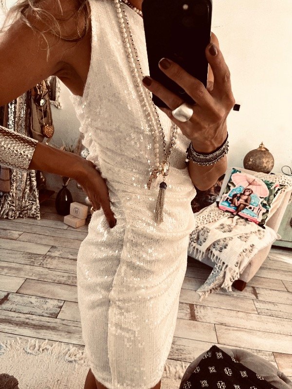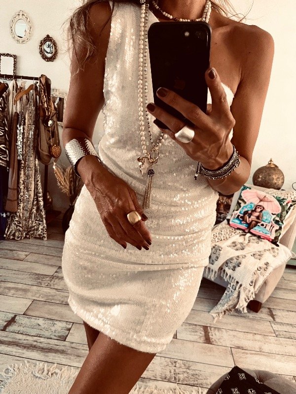 Vestido talla única en lentejuelas elastizado , un hombro y drapeado en la parte de cintura y cadera