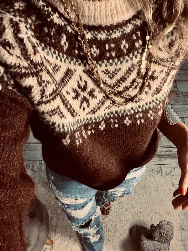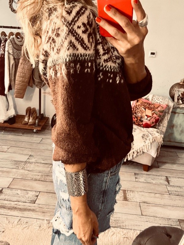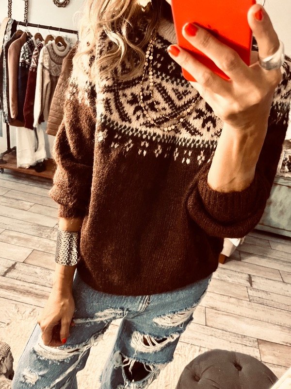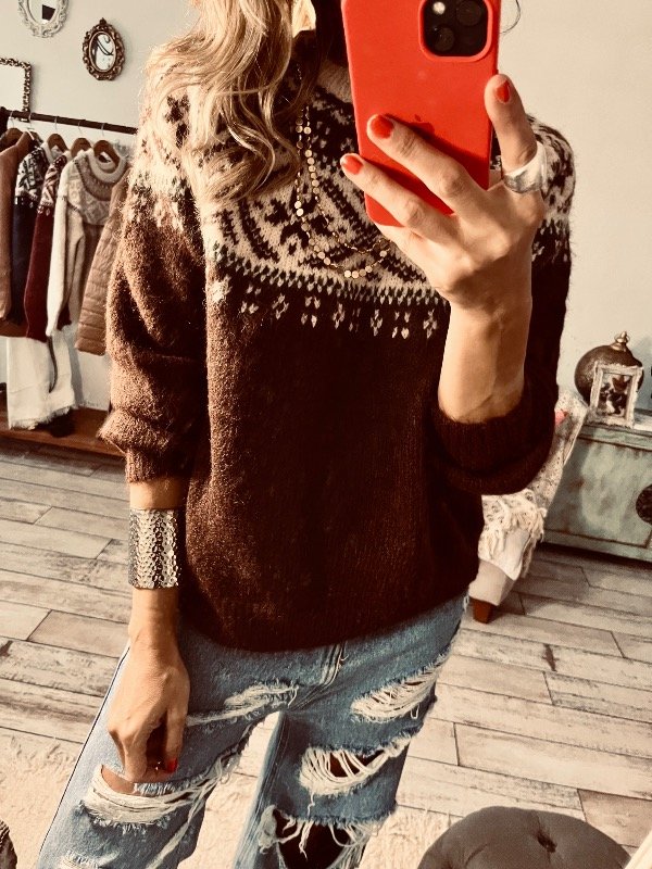 Sweter importado estampado Bariloche , cuello redondo , lana apelmazada suave