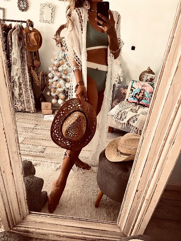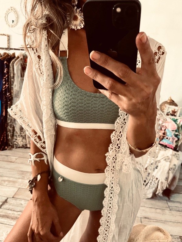 Top texturado combinado con almohadillas desmontables,breteles regulables. Vedetina tiro alto