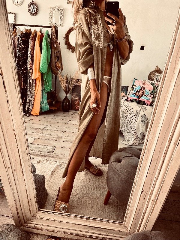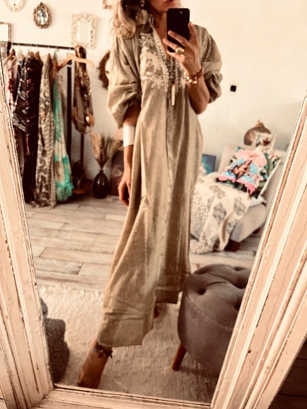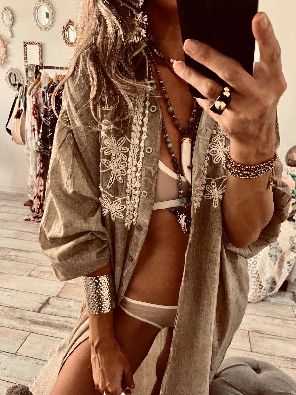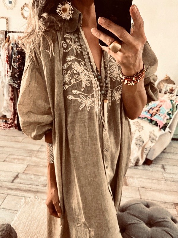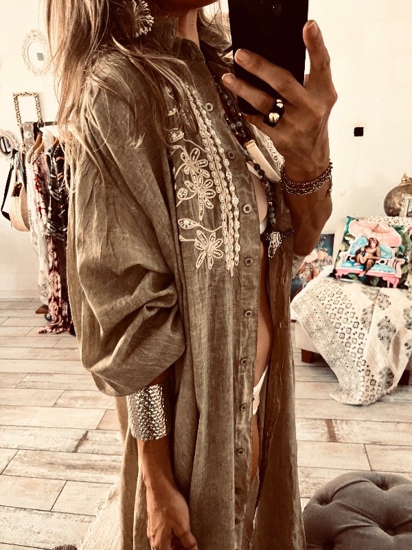 con bordado al frente y abotonado súper amplio , mangas globo con elástico en puño