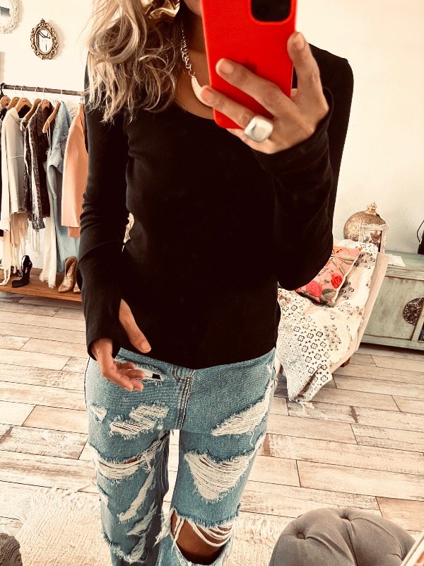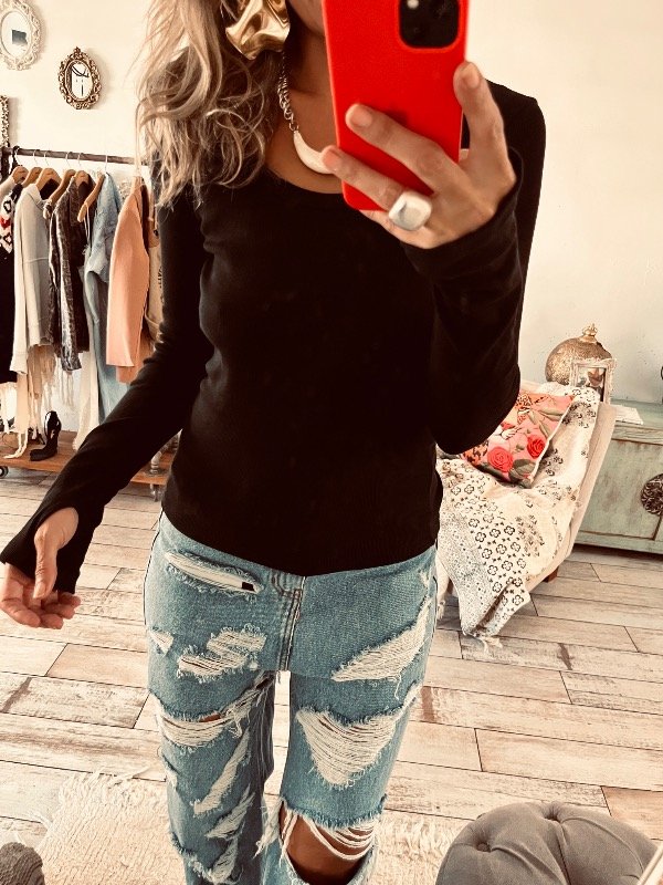 Camiseta en morley manga larga , cuello redondo y agujero en puño , simil guante