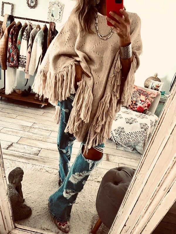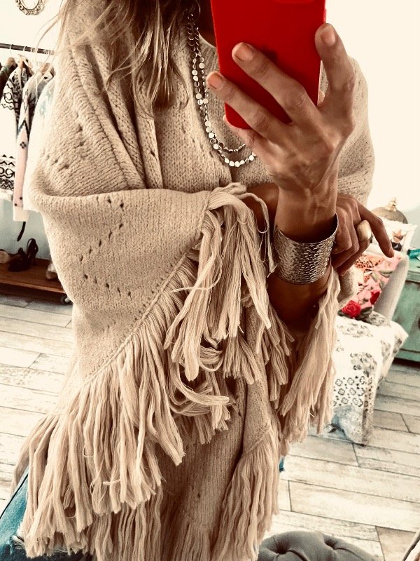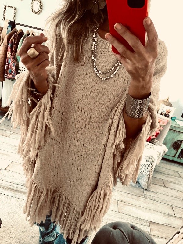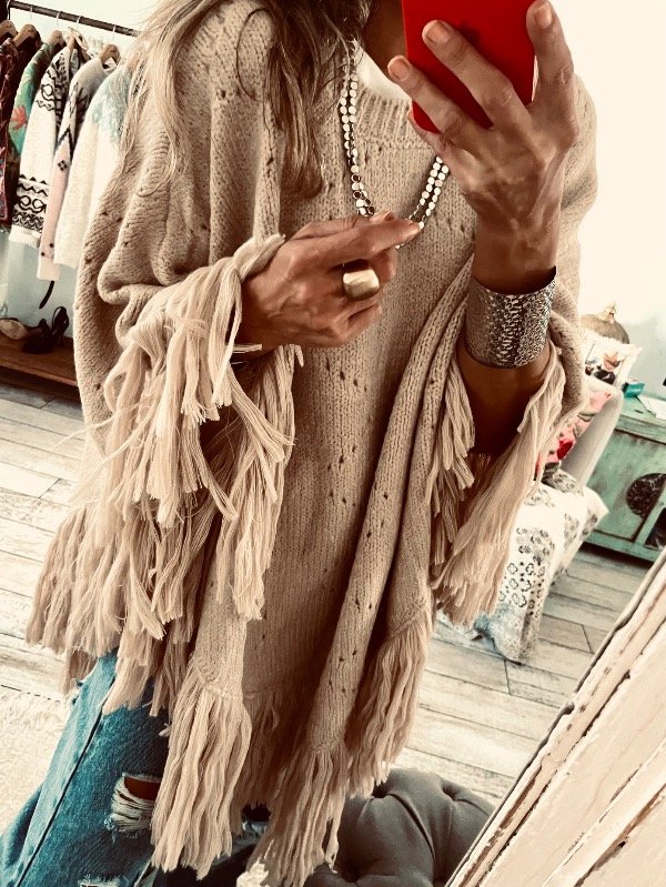 Poncho importado en lana calada con flecos , cuello redondo . Abierto ! Ideal para este invierno y arriba de cualquier outfit